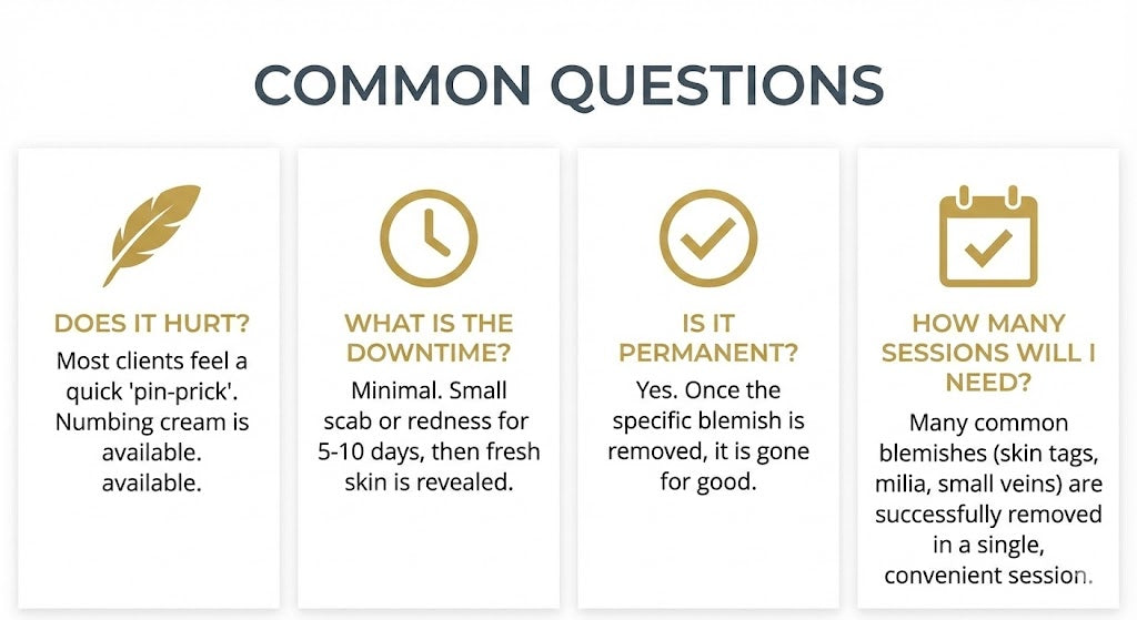 Yes. Our precision technology allows us to safely treat delicate areas, including eyelids (for milia/tags), underarms, and the bikini line. Because our method uses targeted energy, there is no risk to the surrounding skin or eyes.