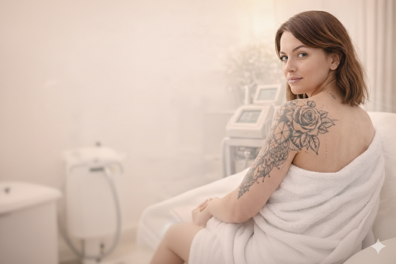 Tattoo ink is broken down gradually over multiple sessions. The body's immune system clears fragmented ink particles between treatments, with visible fading building over time.